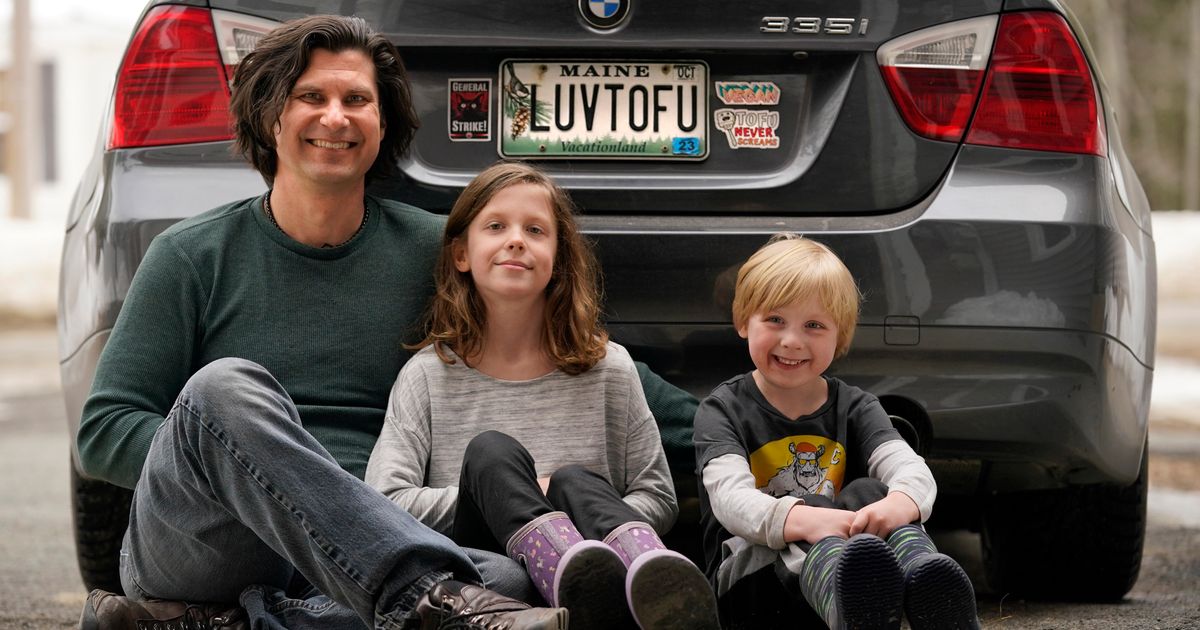 Peter Starostecki and his kids Sadie, center, and Jo Jo, pose behind their car with the vanity license plate that the state of Maine has deemed in appropriate, Wednesday, March 8, 2023, in Poland, Maine. The vegan family’s car will soon have a randomly selected plate. (AP Photo/Robert F. Bukaty)