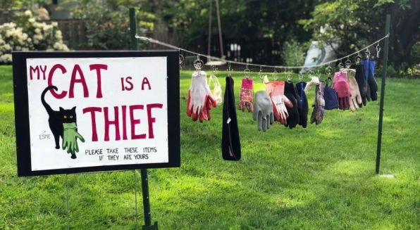 After committing her “petty” crimes in her neighborhood for a year, Felmet finally posted a sign in her yard and fessed up to her cat’s tendencies. Next to a clothesline littered with pairs of stolen gloves and masks, Felmet posted up a sign with a drawing of Esme carrying a single glove in her mouth, reading, “My cat is a thief. Please take these items if they are yours.”
