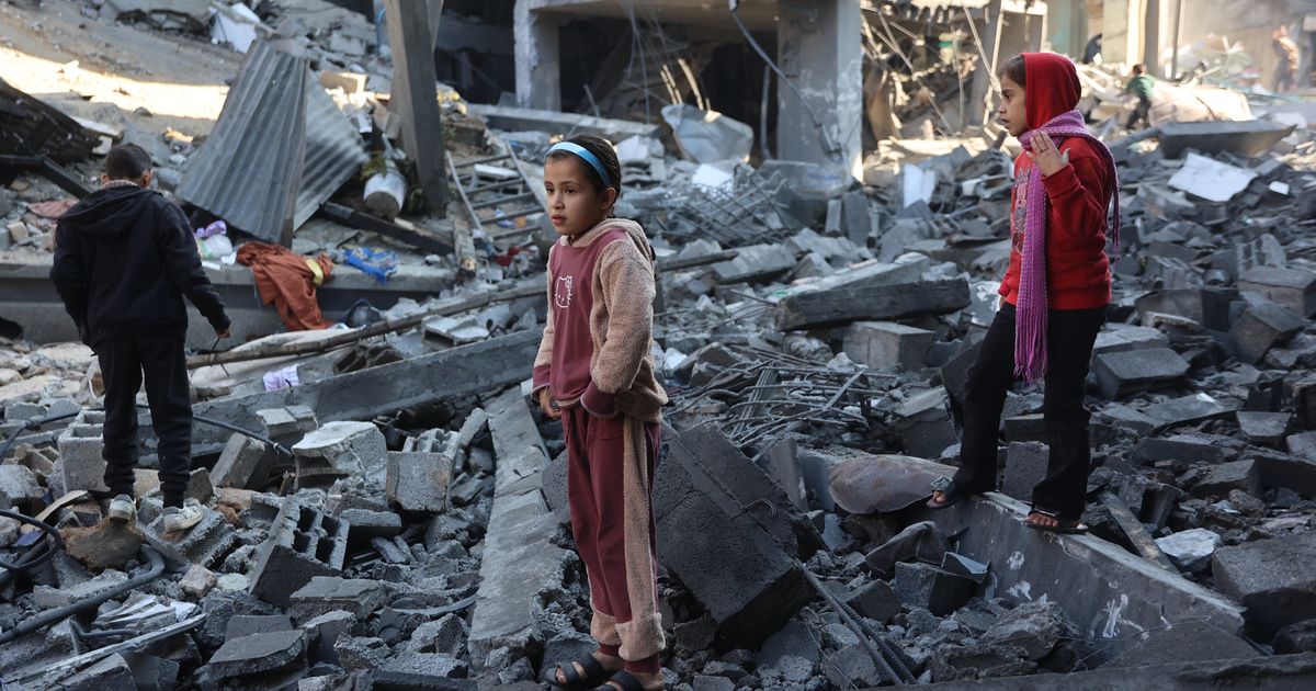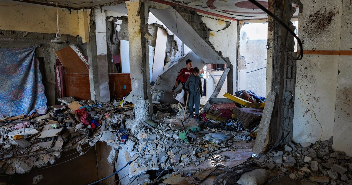 EDITORS NOTE: Graphic content / Palestinian children inspect the damage at the site of an Israeli strike the previous night, …