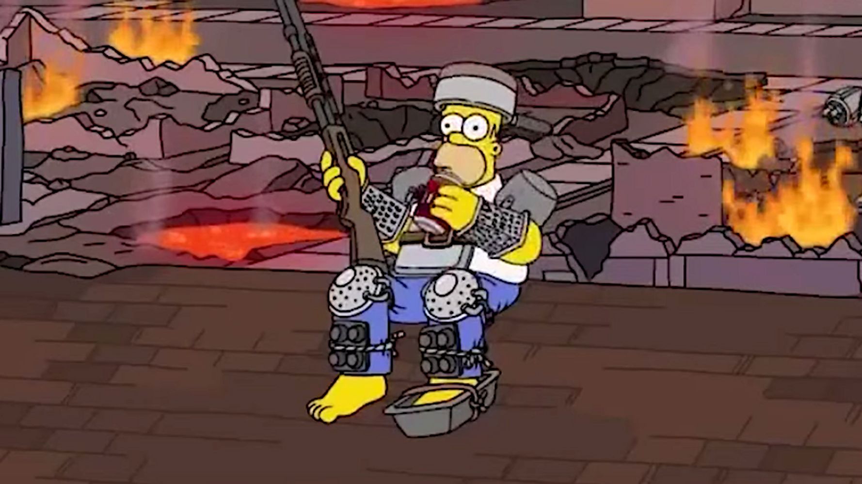 Cut to a roof-bound Homer in homemade body armor futilely watching over fiery rubble after a siege.